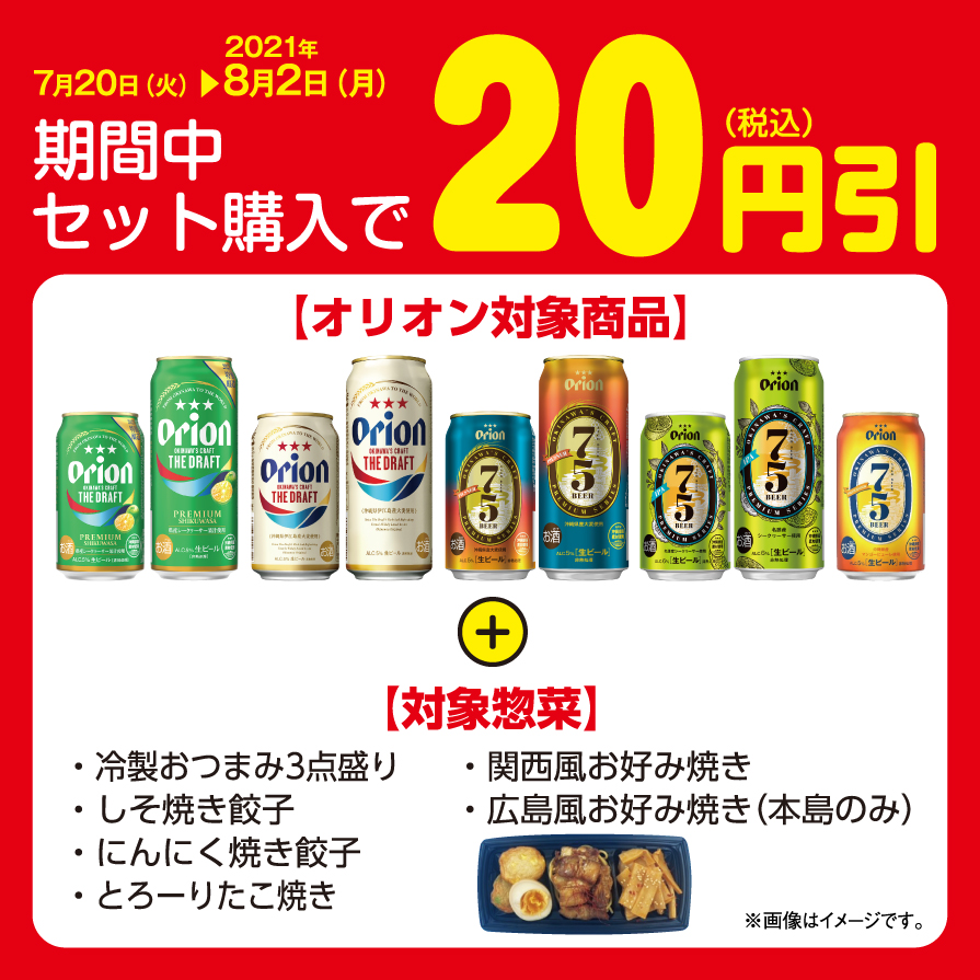 対象のオリオンビールとおつまみ惣菜をセットで購入すると20円(税込)引き!