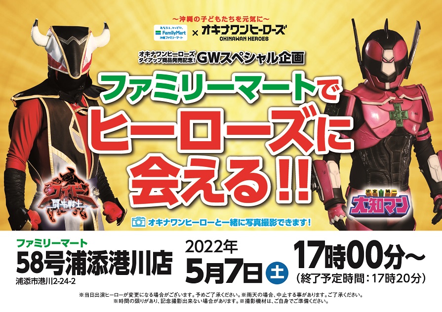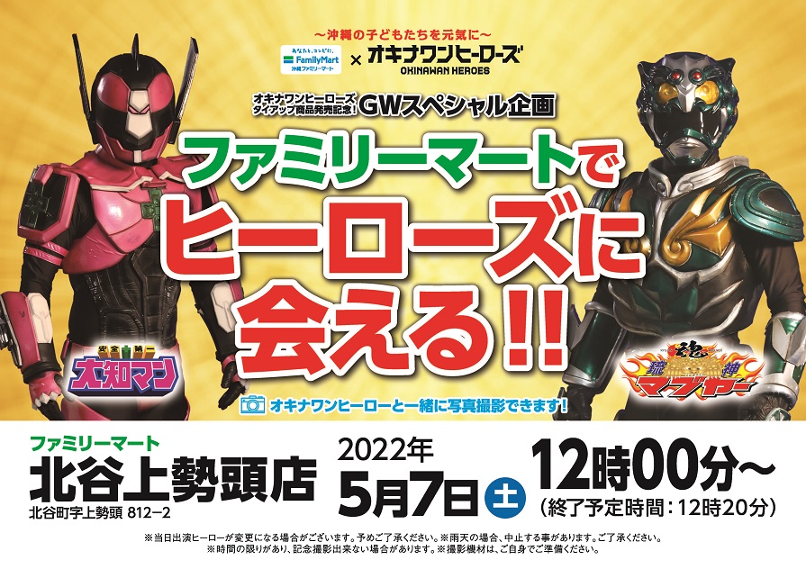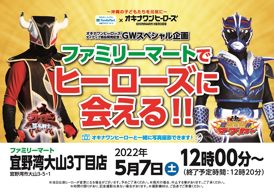 「沖縄ファミリーマート×オキナワンヒーローズタイアップ商品発売」を記念しまして、ゴールデンウイークスペシャル企画として【ファミリーマートでヒーローズに会える‼】を今週5月7日土曜日に開催致します。