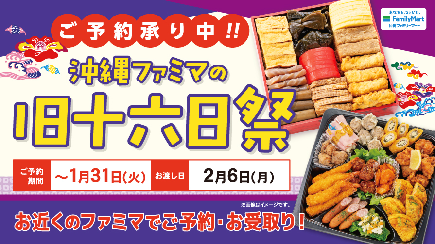 「旧十六日祭」の需要に対応した沖縄重箱、オリジナルのオードブル、お供えセットなど、県内ファミリーマート全店にてご予約承ります。※受付期間は1月31日(火)まで