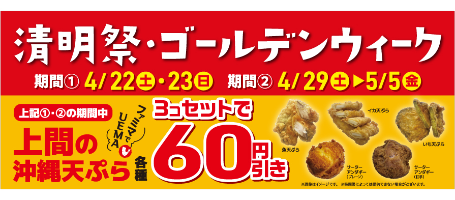 4月22日(土)・23(日)、4月29日(土)~5月5日(金)の期間限定で上間の沖縄天ぷらが「3個購入毎に60円引き」!
