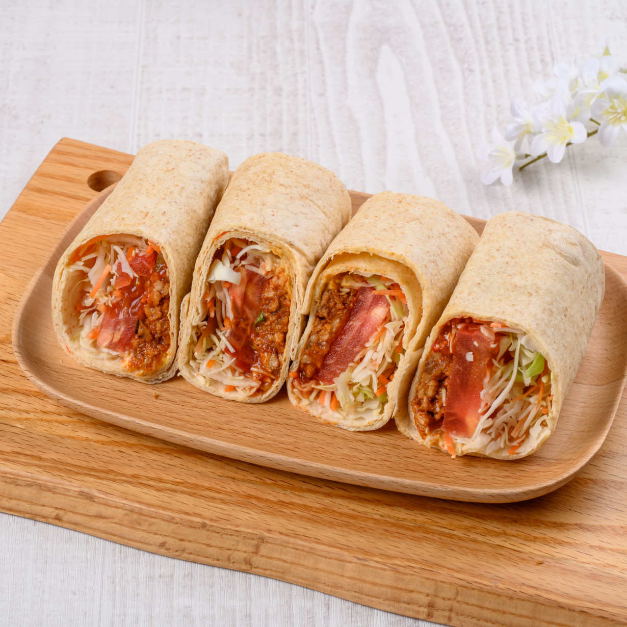 【内   容】旬の豊見城産ちゅらとまとを使用したトルティーヤ。大豆ミートを使用したタコスミートに野菜やチー ズソース、サルサソースにスライストマトを組み合わせたタコス風トルティーヤです。
