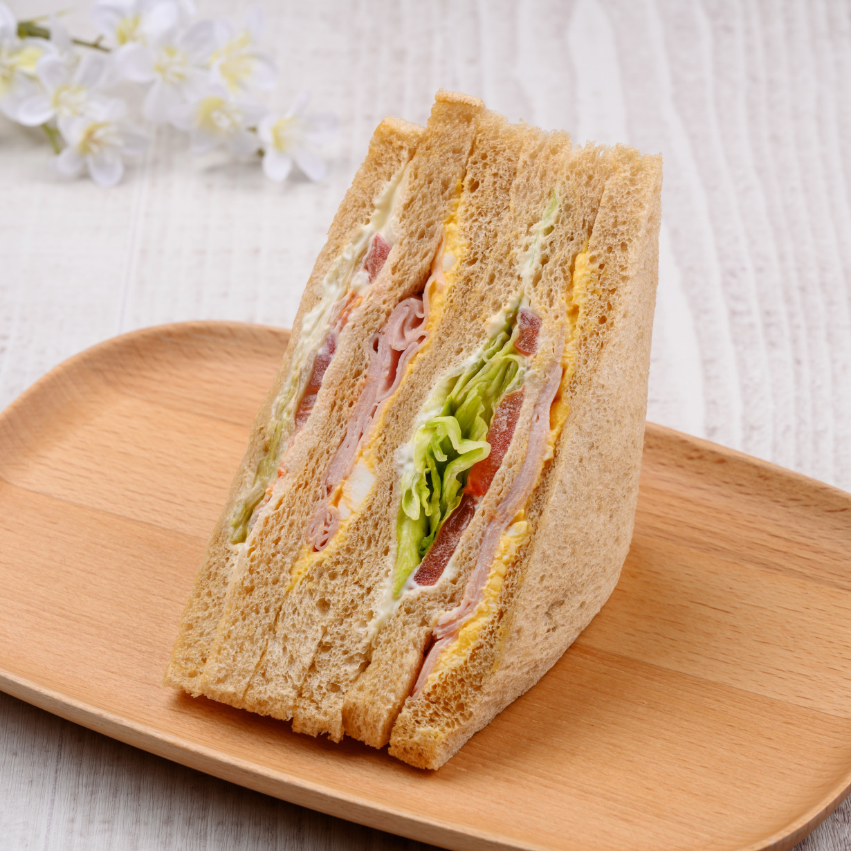 【内   容】旬の豊見城産ちゅらとまとを使用したサンドイッチ。トマト、レタス、ハム、たまごサラダを全粒粉入り食パンでサンドしました。