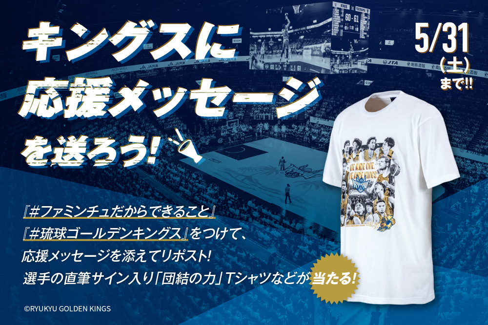 沖縄ファミリーマート公式アカウントXをフォローして、「#ファミンチュだからできること」「#琉球ゴールデンキングス」とキングスへの応援メッセージ投稿すると、選手の直筆サイン入り「団結の力」Tシャツなどが当たる!