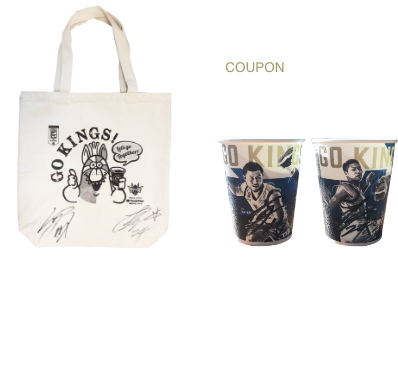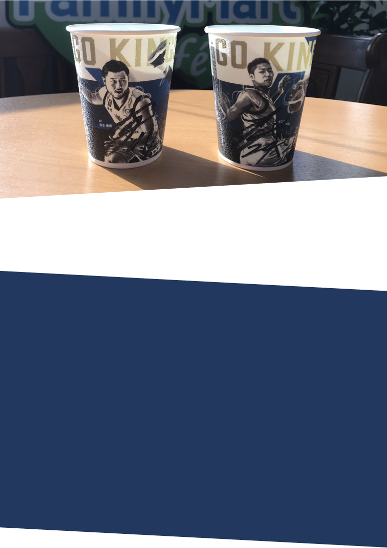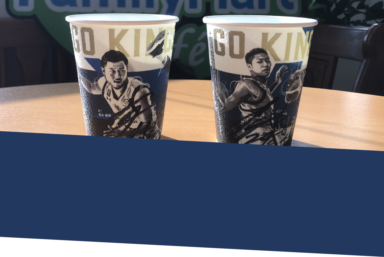 ①KINGS ファミカフェカップ2つ(橋本選手サイン入り1 つ・田代選手サイン入り1つ)