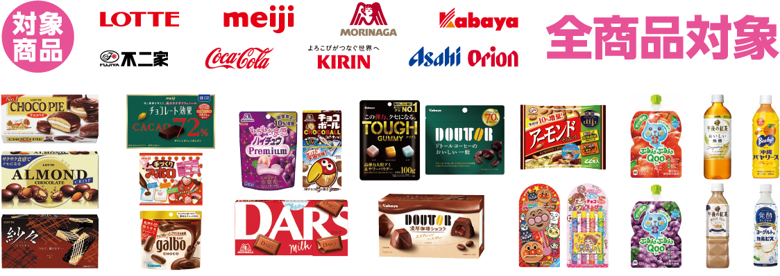 【ご注意】※お客様の住所・電話番号が不明確な場合や、転居による住所変更などの理由により、ご連絡が出来ない場合は、当選を無効とさせて頂きます。※当キャンペーンと同時期に行われている同一商品を対象としたキャンペーンには、当選できない場合がございます。予めご了承ください。※本キャンペーンのご応募の際に入力頂きました個人情報(郵便番号、ご住所、お名前、電話番号等)は、㈱国和システムと㈱ロッテ、㈱明治、森永製菓㈱、カバヤ食品㈱、㈱不二家、沖縄コカ・コーラボトリング㈱、キリンビバレッジ㈱、アサヒオリオン飲料㈱で共同利用し、それぞれ同時期に実施している同一商品を対象とした他のキャンペーンとの重複当選を避ける目的で利用させて頂きます。また、㈱国和システムでは賞品の発送、応募者・当選者への諸連絡にも利用し、マーケティング等の目的のために個人を特定しない統計的情報の形で利用させていただきます。個人情報の管理責任者は㈱国和システムです。※一部の店舗では取扱いのない場合がございます。※公共料金、各種通信販売、ファミマ・ドット・コムショッピングサービス、クレジット・ローンなどのお支払い、toto、たばこなどは含みません。割引実施時(「売価引き」等)は、割引後の合計金額が対象金額となります。