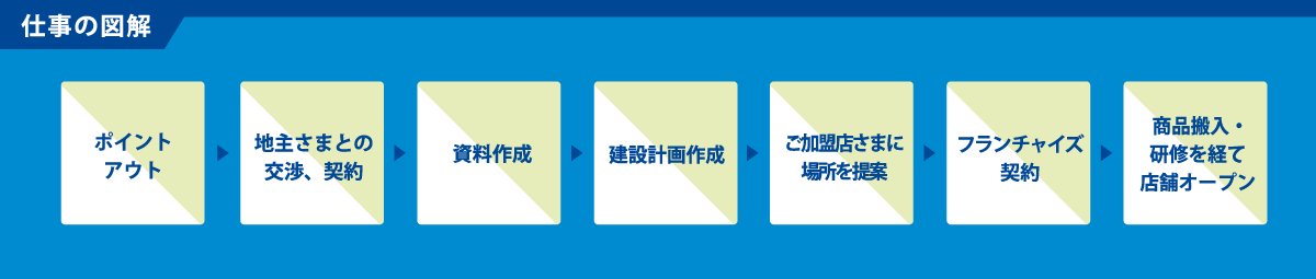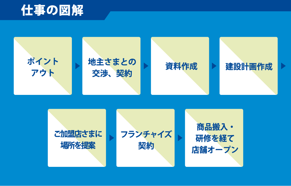 入社後は営業部に在籍し、2019年から現在の部署に異動となりました。店舗の事情や地域のニーズを肌で感じて理解できており、その経験が開発部でも活かされています。話す相手が店長さんか地主さんかという違いはありますが、共通しているのは、思いをこめて真摯に対応することです。